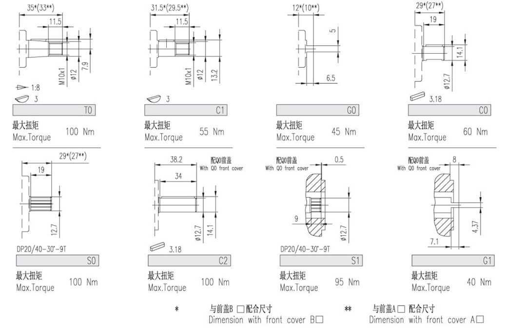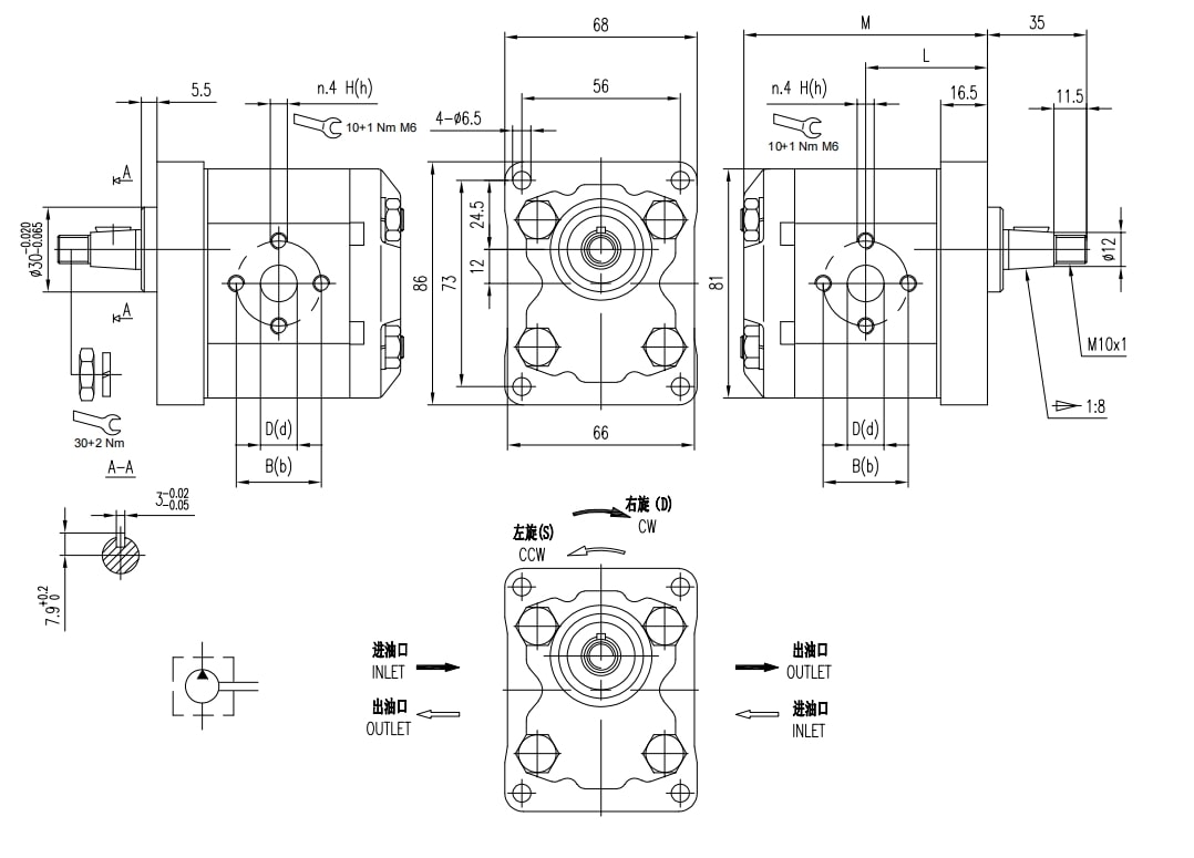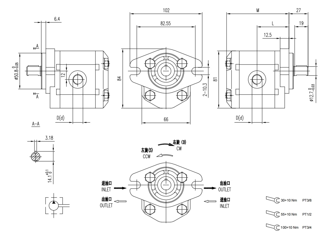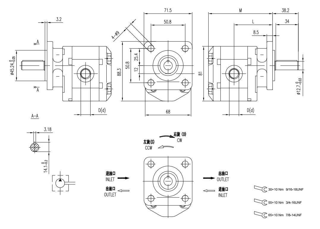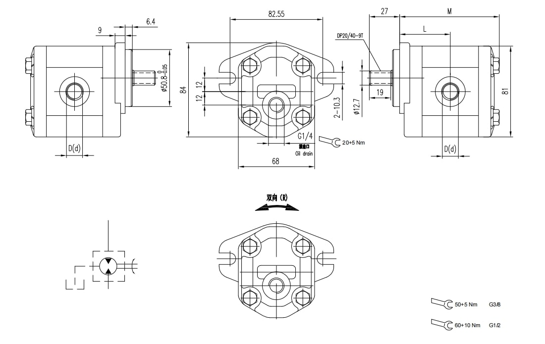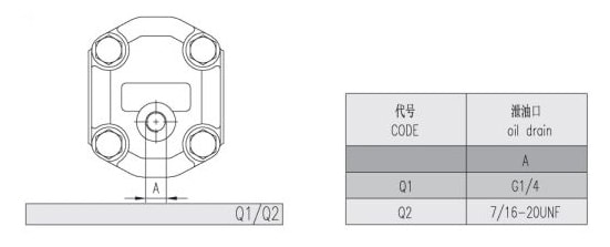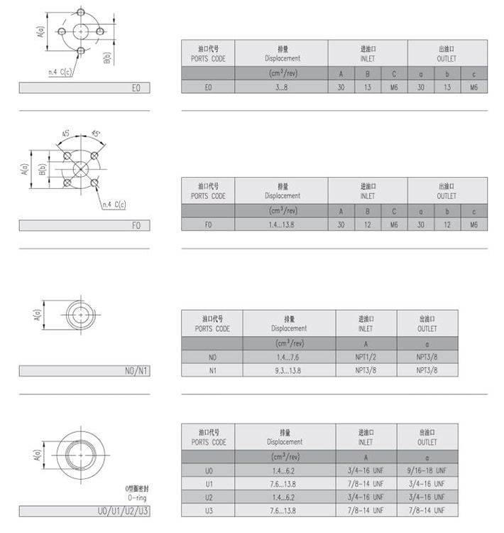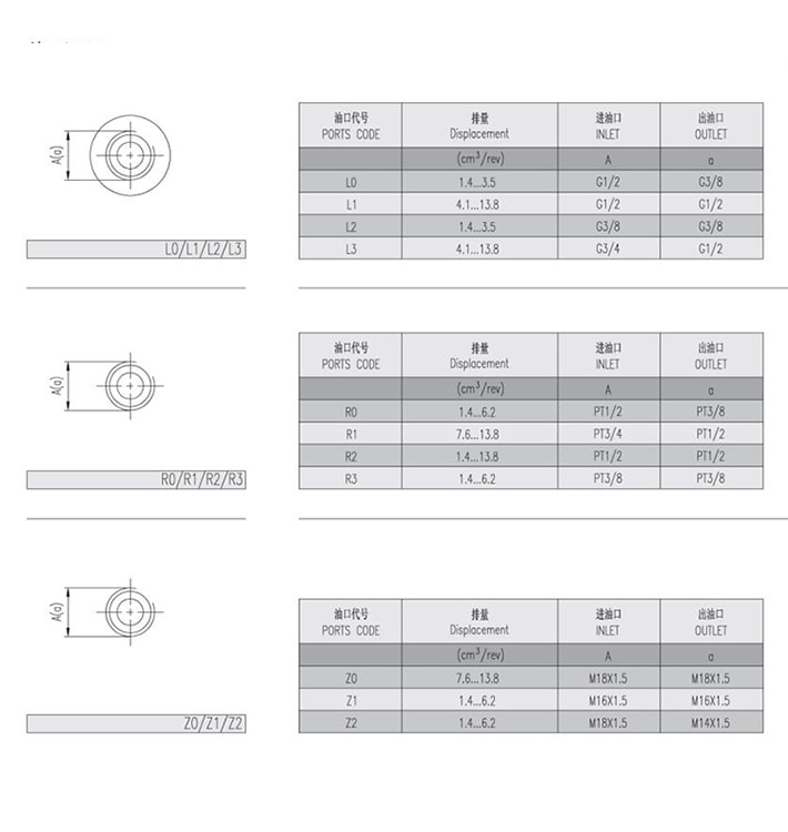 | 排量 | 最大壓力 | 最高轉速 | 最低轉速 | 重量 | 尺寸 | 油口代碼 | 進油口 | 出油口 | |||