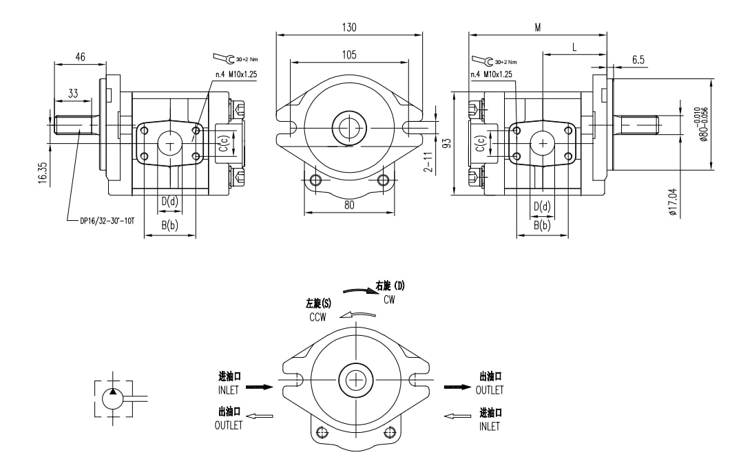| 排量 | 最大壓力 | 最高轉速 | 最低轉速 | 重量 | 尺寸 | 油口代碼 | 進油口 | 出油口 | ||||||||